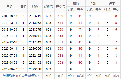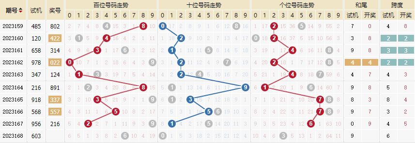 2022168期 试机号 363 开奖号 203 和 5