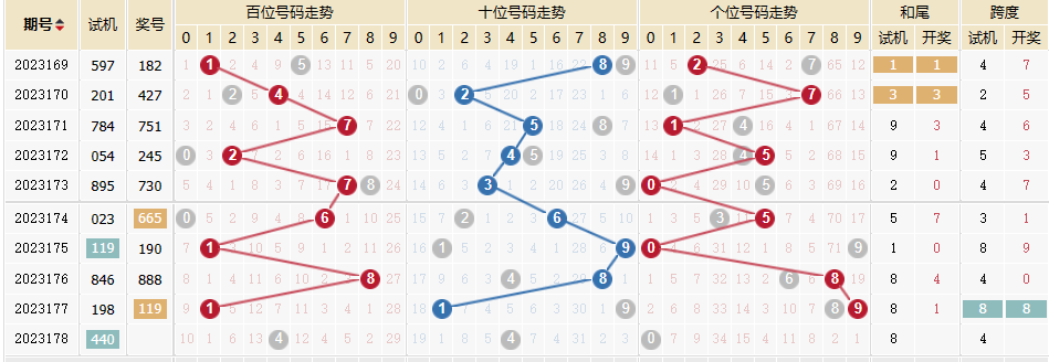 期数 | 试机号 | 关注码 | 金码 | 对应码 | 开奖号 | 出号 |