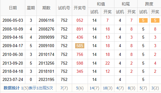 2021195期 试机号 606 开奖号 752 和 14