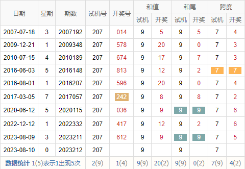 2007212期 试机号 270 开奖号 319 和 13