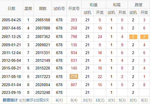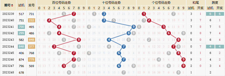 期数 | 试机号 | 关注码 | 金码 | 对应码 | 开奖号 | 出号 |