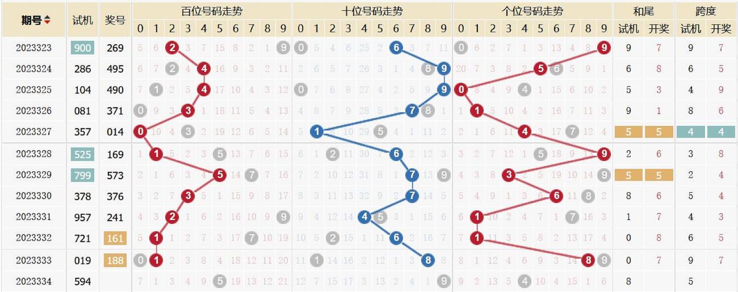 期数 | 试机号 | 关注码 | 金码 | 对应码 | 开奖号 | 出号 |