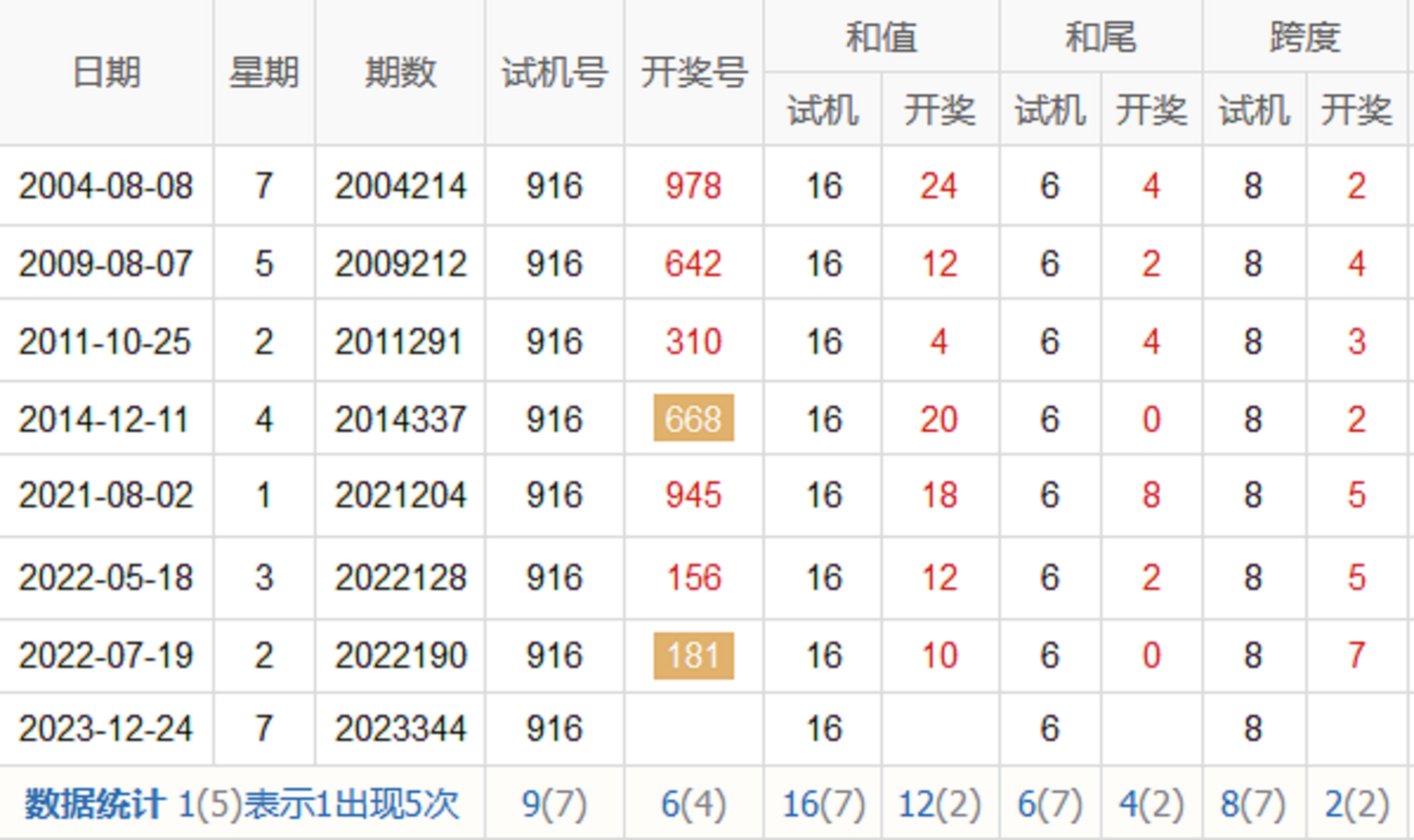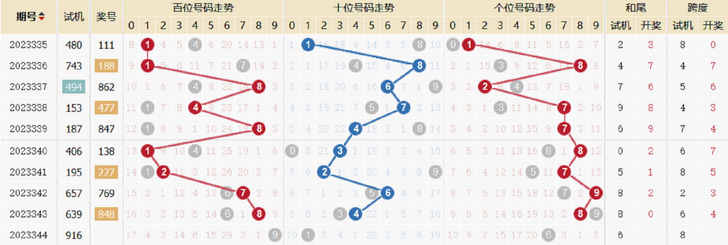 期数 | 试机号 | 关注码 | 金码 | 对应码 | 开奖号 | 出号 |