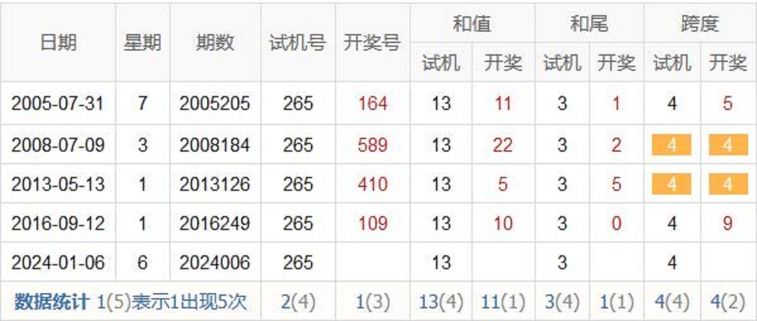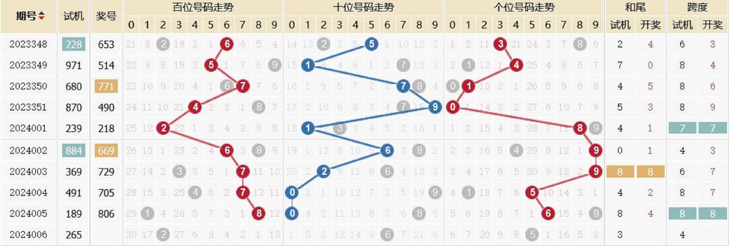 期数 | 试机号 | 关注码 | 金码 | 对应码 | 开奖号 | 出号 |