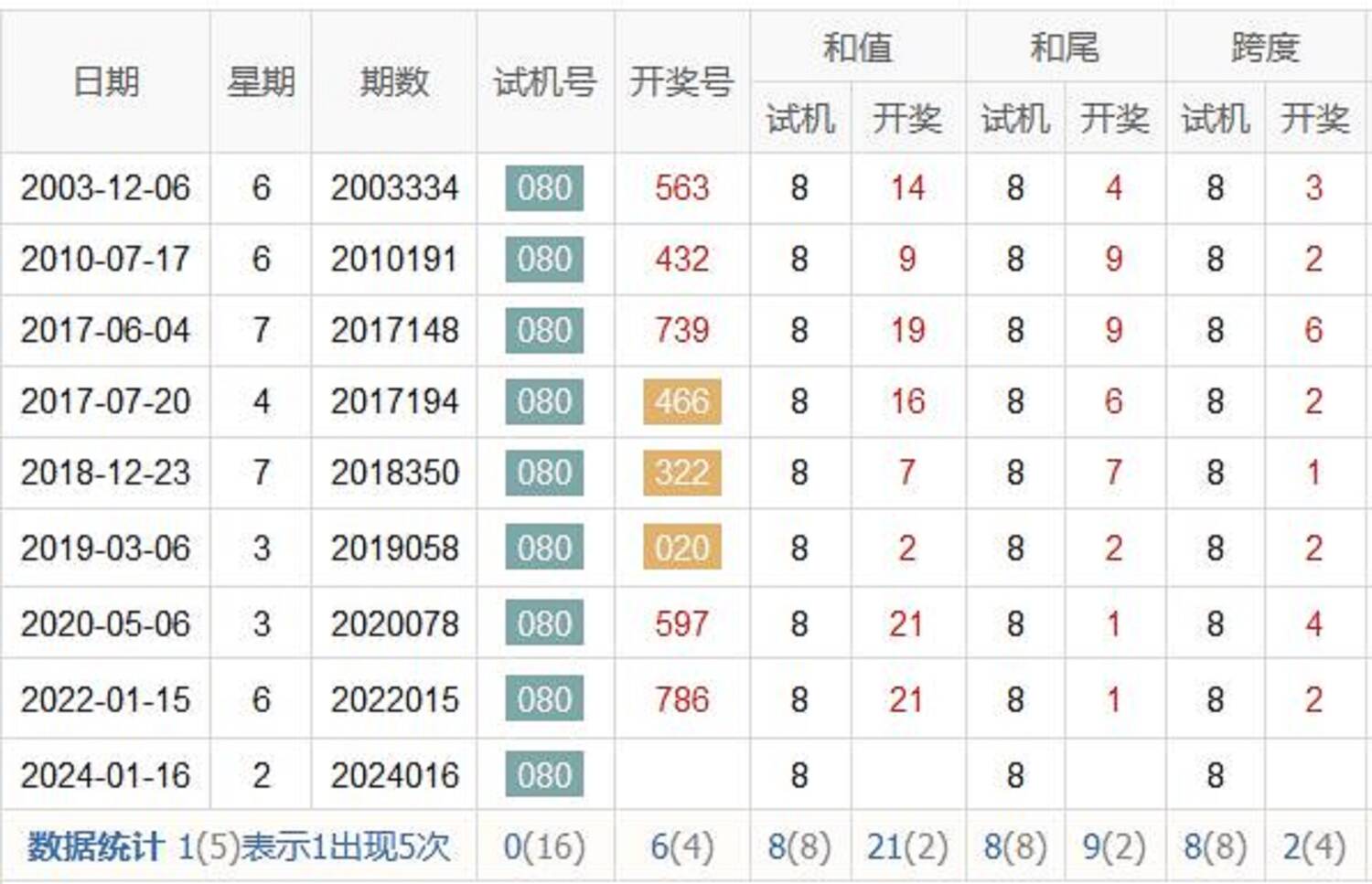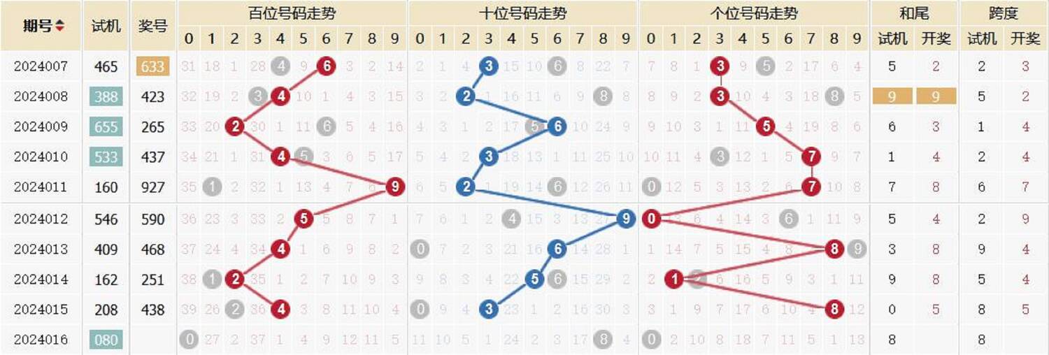 期数 | 试机号 | 关注码 | 金码 | 对应码 | 开奖号 | 出号 |