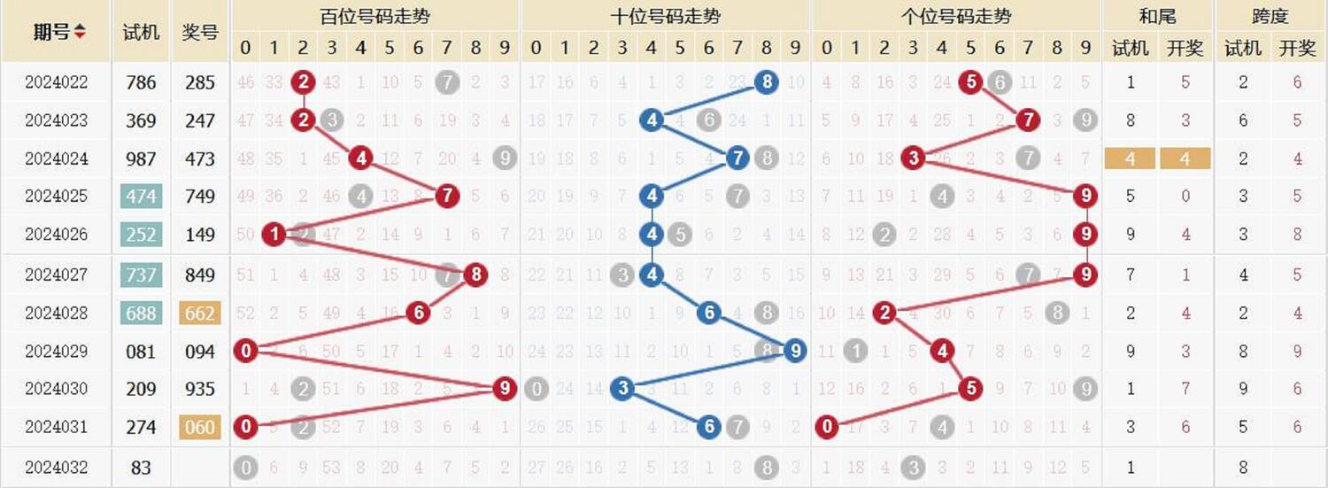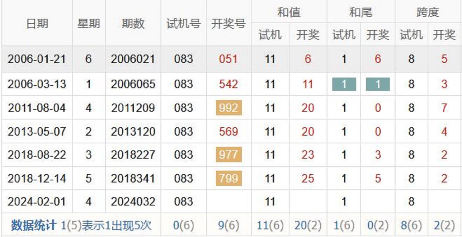 期数 | 试机号 | 关注码 | 金码 | 对应码 | 开奖号 | 出号 |