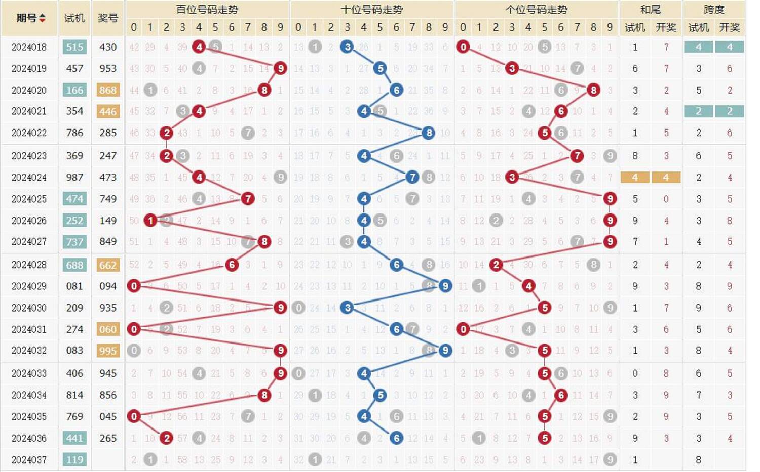 期数 | 试机号 | 关注码 | 金码 | 对应码 | 开奖号 | 出号 |