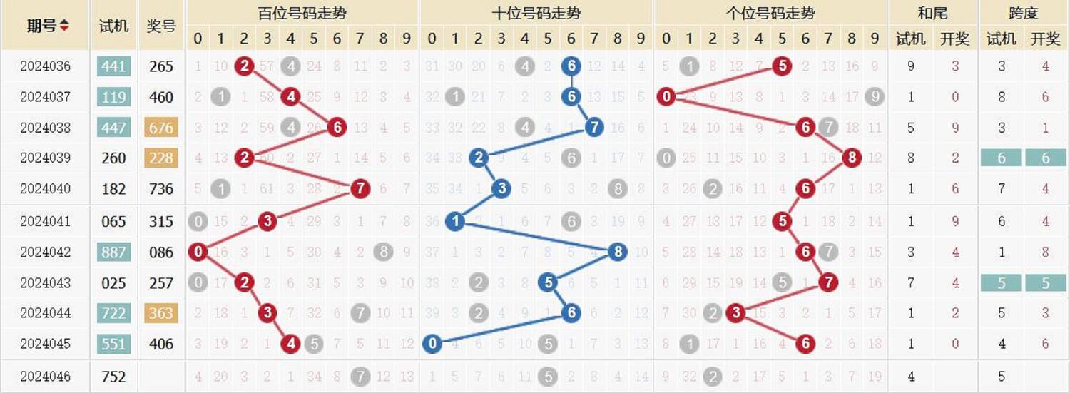 期数 | 试机号 | 关注码 | 金码 | 对应码 | 开奖号 | 出号 |