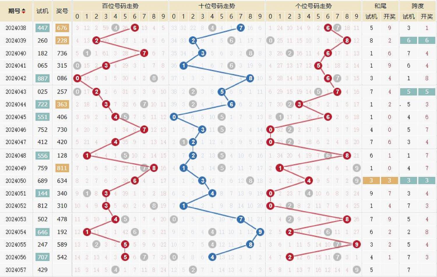 期数 | 试机号 | 关注码 | 金码 | 对应码 | 开奖号 | 出号 |