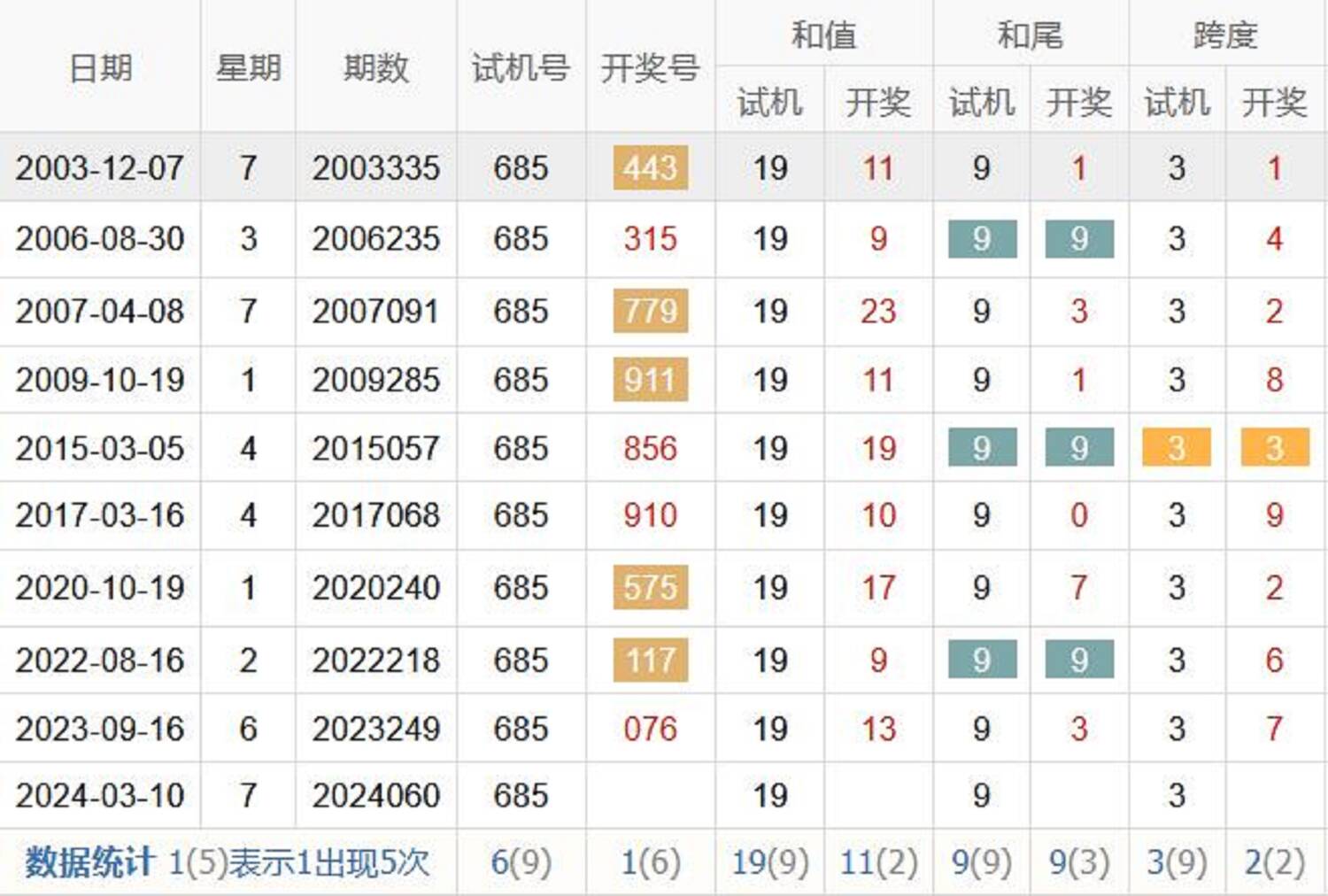 和尾:9 跨度:3