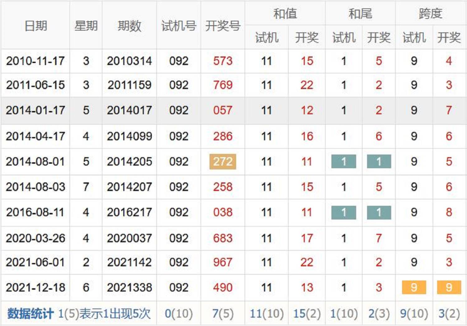 历史出现情况统计