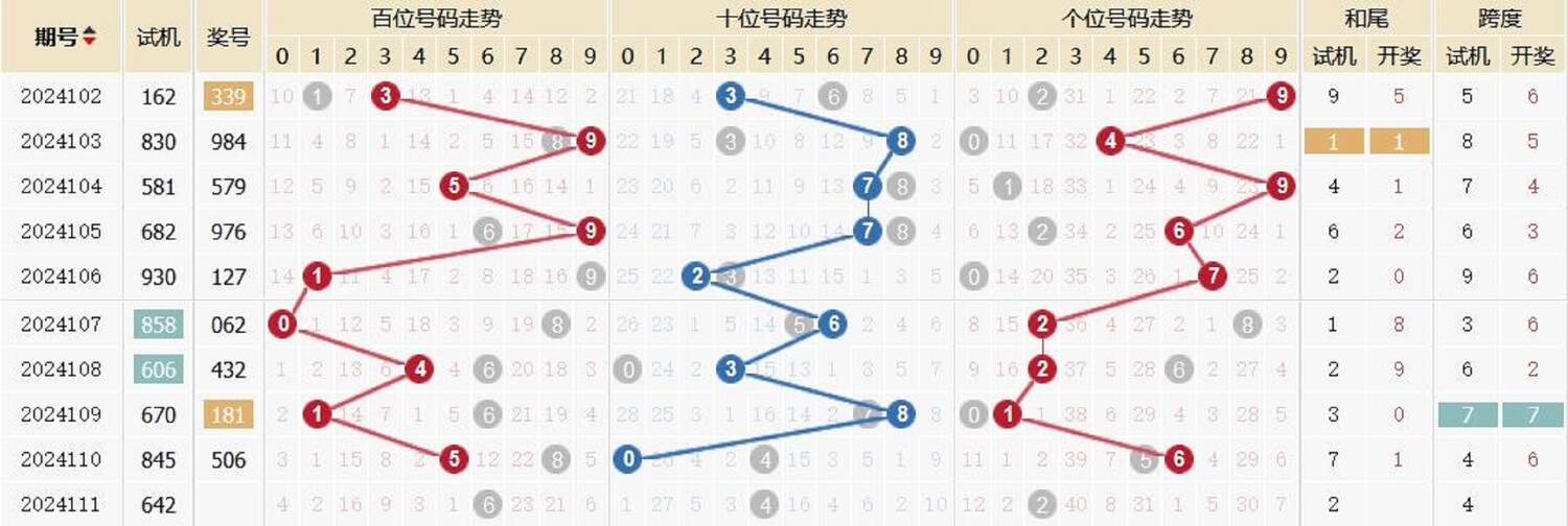 期数 | 试机号 | 关注码 | 金码 | 对应码 | 开奖号 | 出号 |