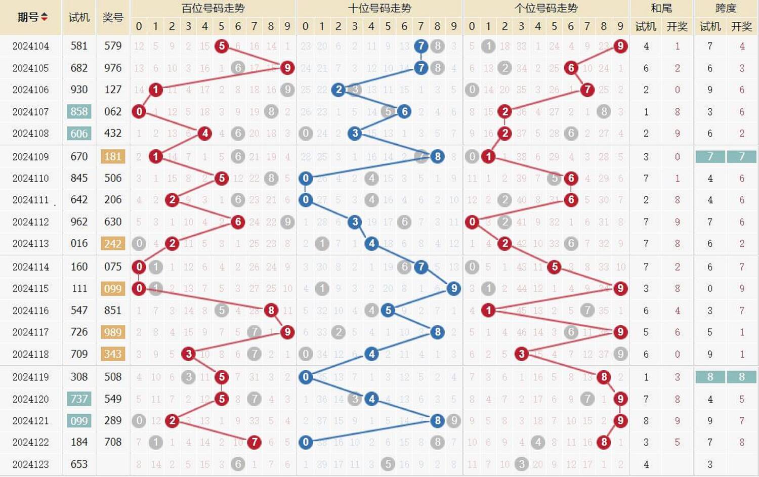 期数 | 试机号 | 关注码 | 金码 | 对应码 | 开奖号 | 出号 |