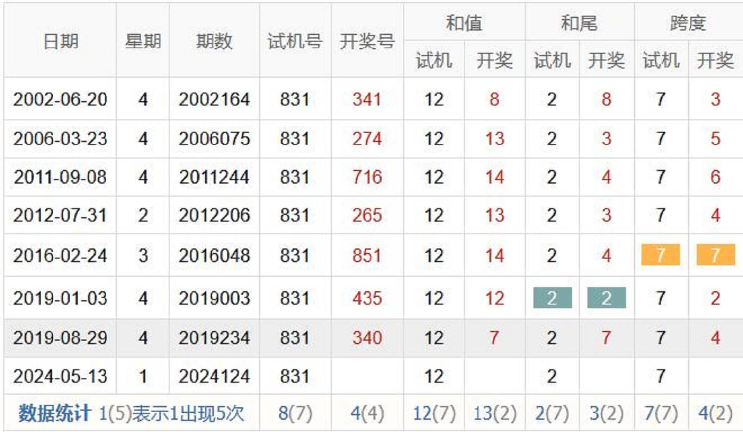 历史出现情况统计
