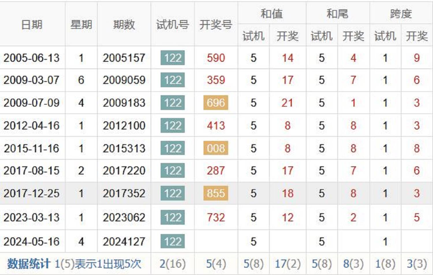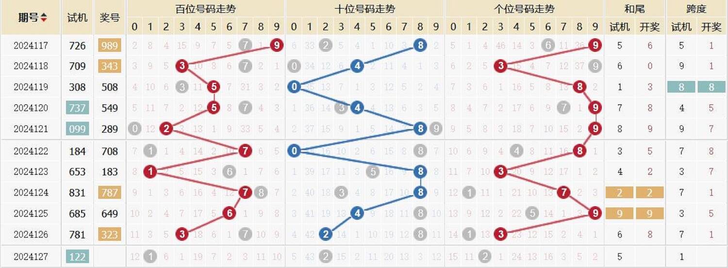 期数 | 试机号 | 关注码 | 金码 | 对应码 | 开奖号 | 出号 |