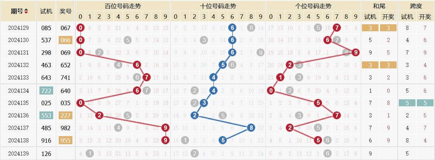 期数 | 试机号 | 关注码 | 金码 | 对应码 | 开奖号 | 出号 |