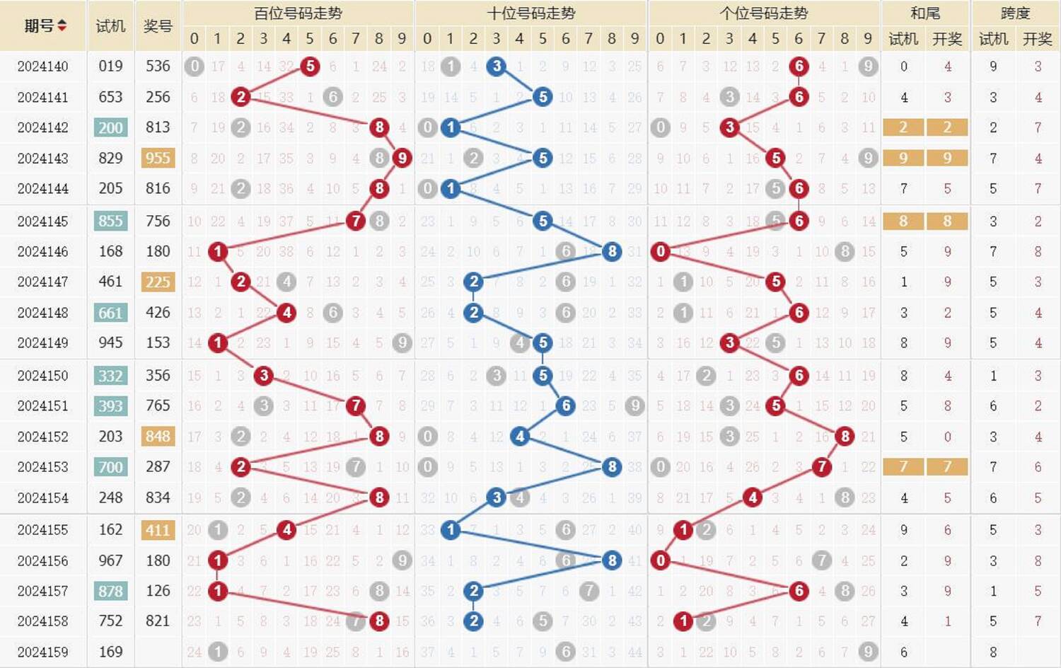 期数 | 试机号 | 关注码 | 金码 | 对应码 | 开奖号 | 出号 |