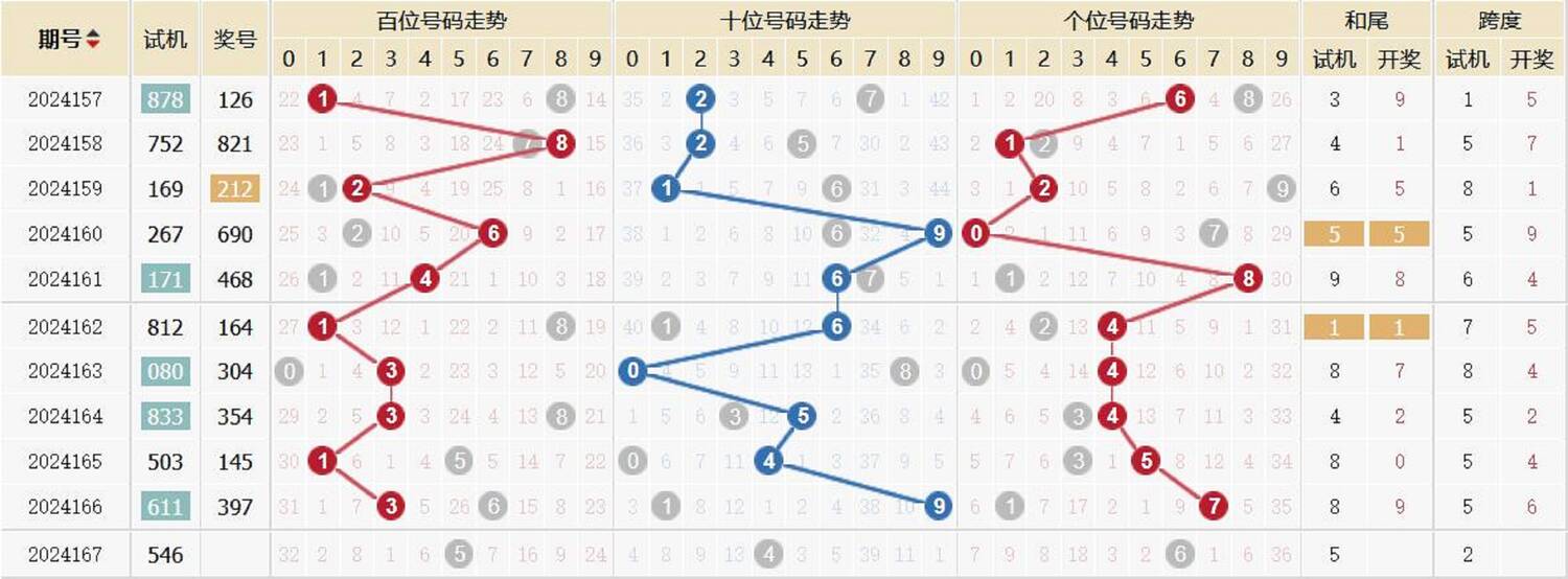 期数 | 试机号 | 关注码 | 金码 | 对应码 | 开奖号 | 出号 |