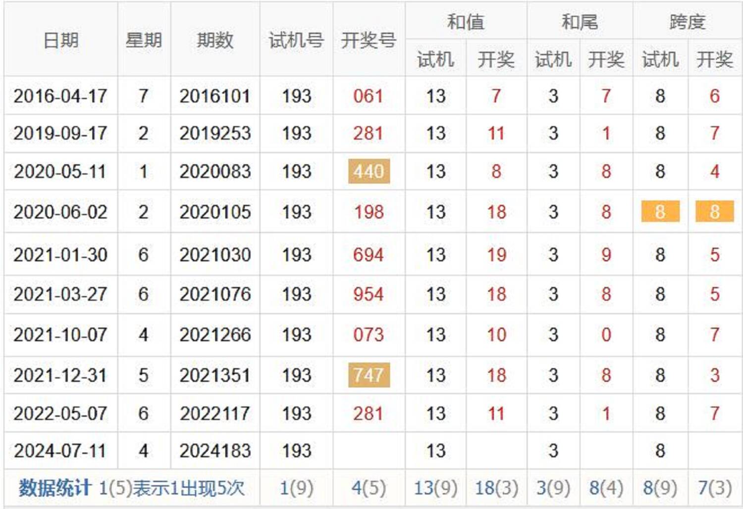 期数 | 试机号 | 关注码 | 金码 | 对应码 | 开奖号 | 出号 |