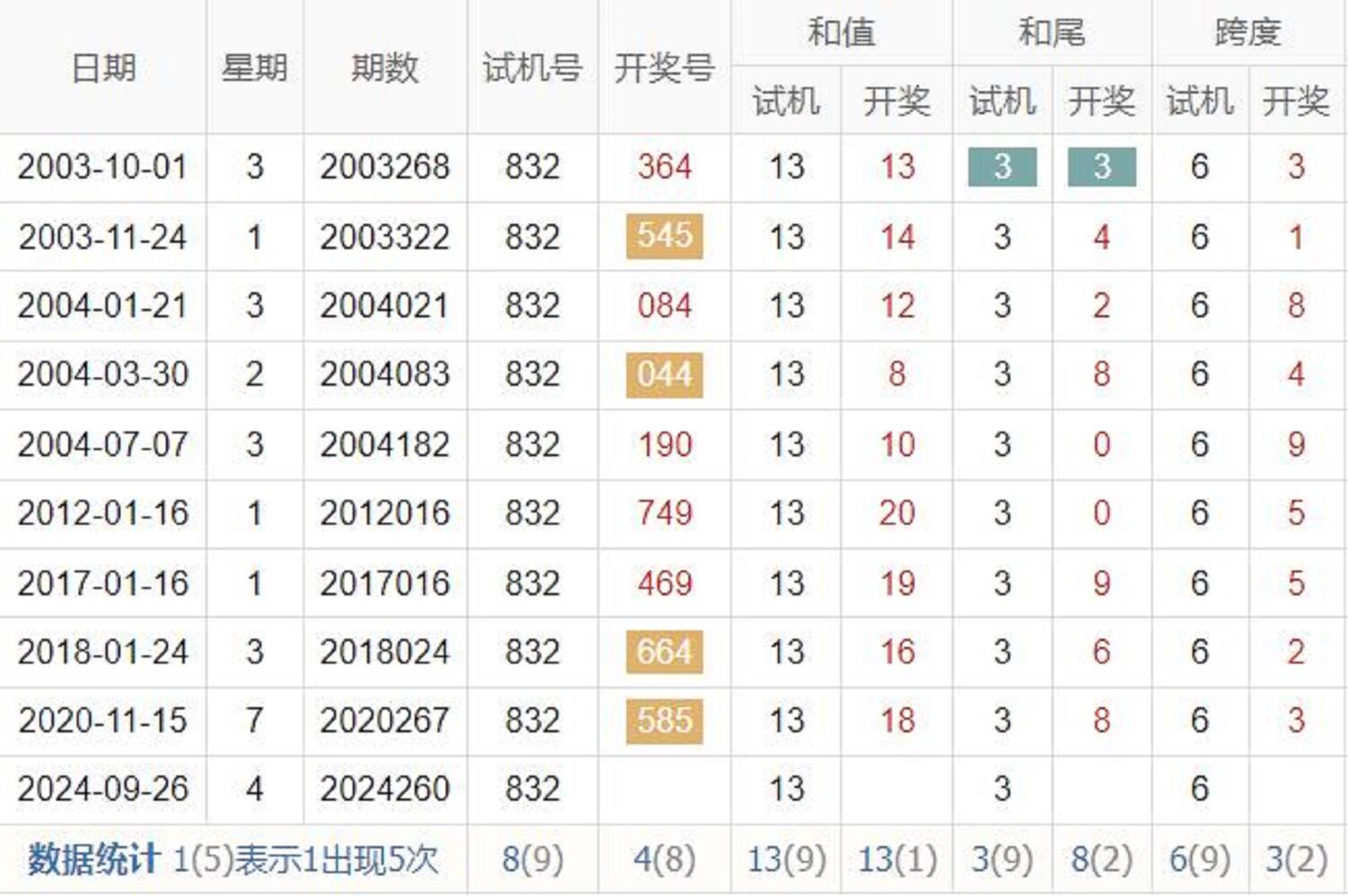 期数 | 试机号 | 关注码 | 金码 | 对应码 | 开奖号 | 出号 |