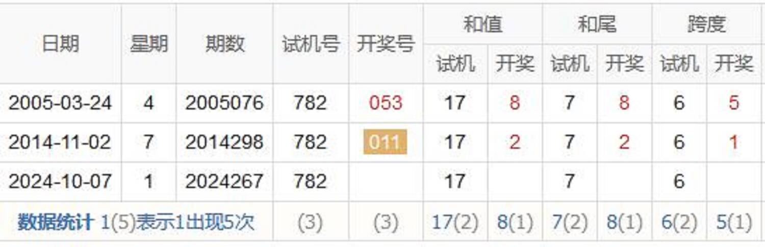 期数 | 试机号 | 关注码 | 金码 | 对应码 | 开奖号 | 出号 |