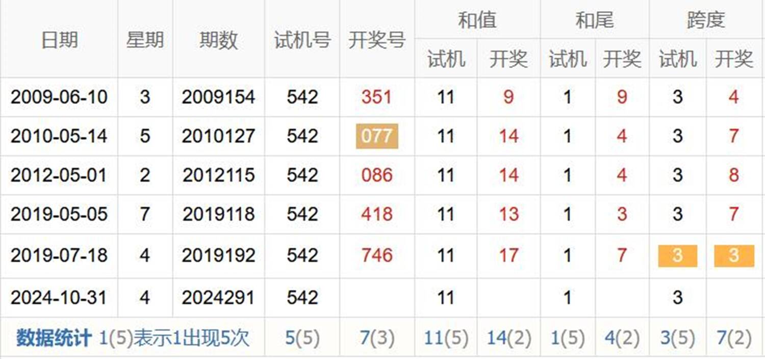 期数 | 试机号 | 关注码 | 金码 | 对应码 | 开奖号 | 出号 |