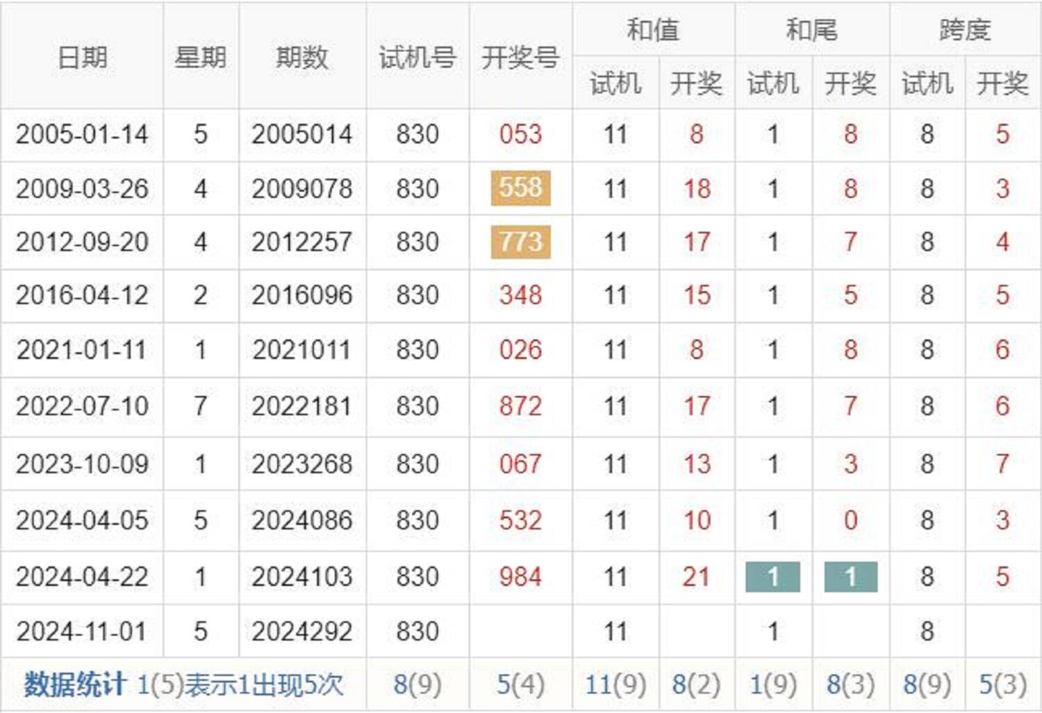 历史出现情况统计