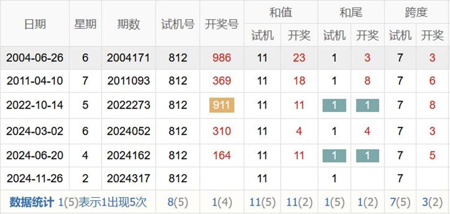 期数 | 试机号 | 关注码 | 金码 | 对应码 | 开奖号 | 出号 |