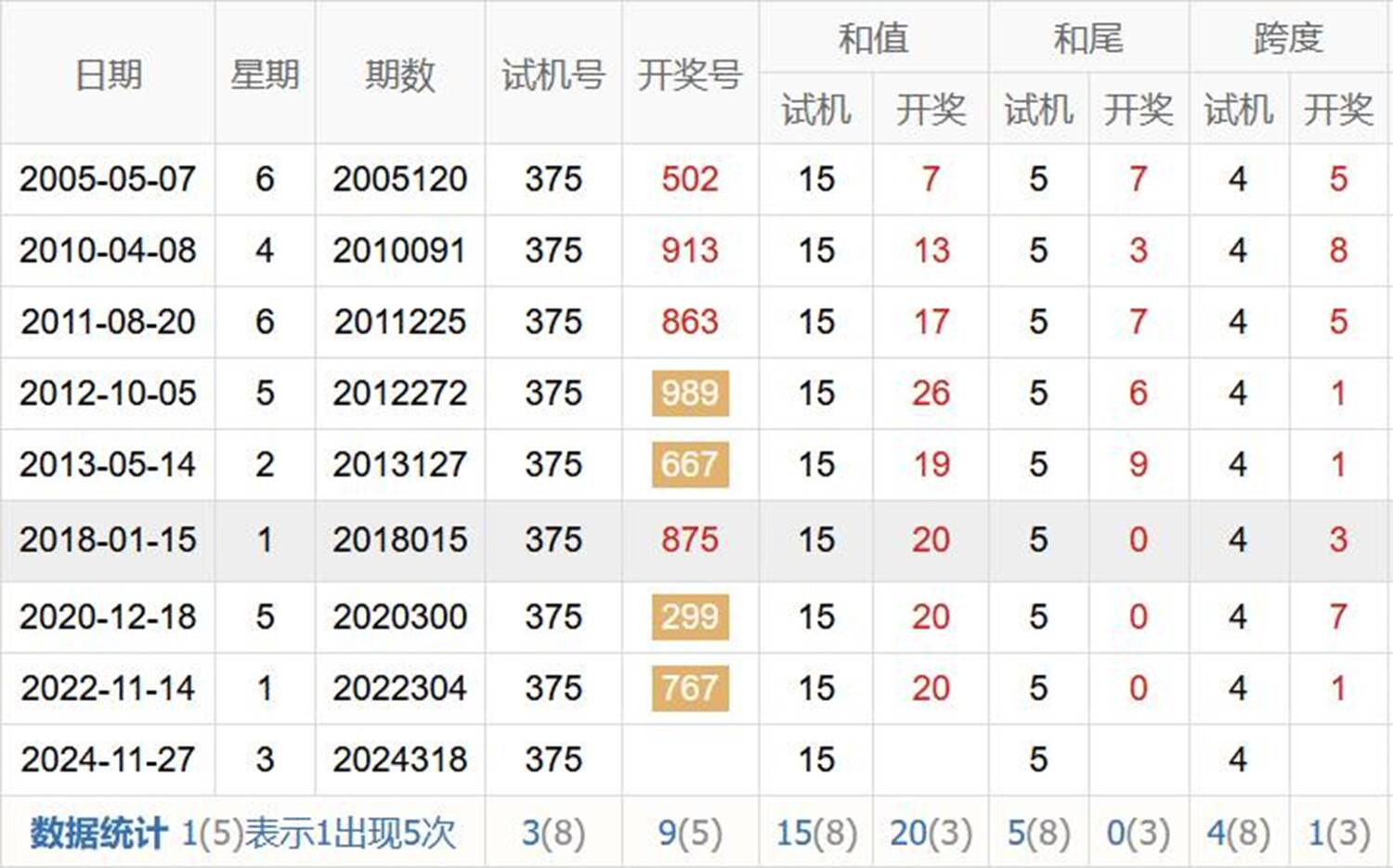 期数 | 试机号 | 关注码 | 金码 | 对应码 | 开奖号 | 出号 |