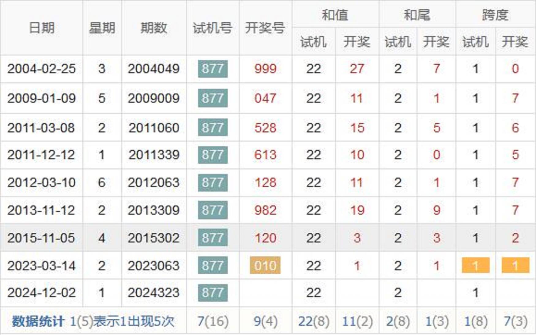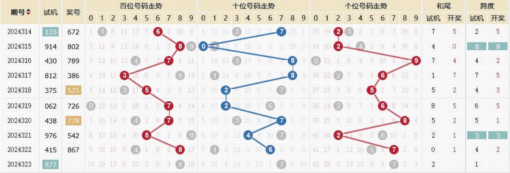 期数 | 试机号 | 关注码 | 金码 | 对应码 | 开奖号 | 出号 |