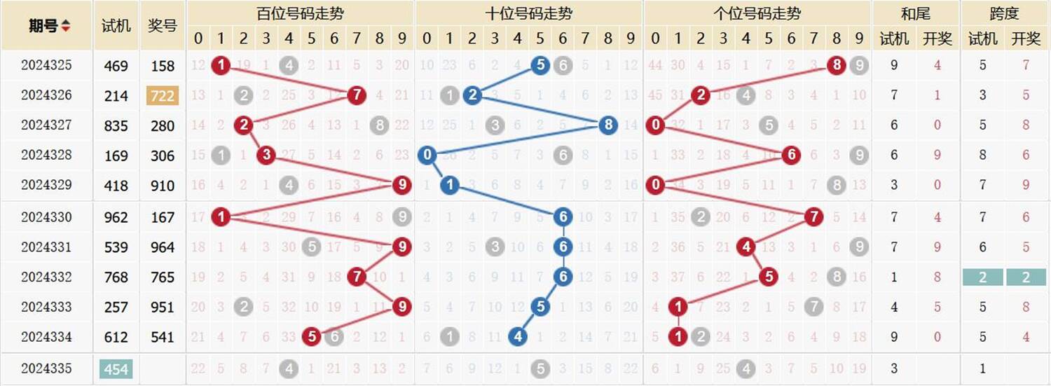 期数 | 试机号 | 关注码 | 金码 | 对应码 | 开奖号 | 出号 |