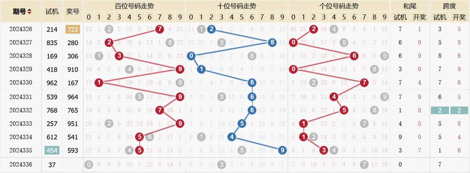 期数 | 试机号 | 关注码 | 金码 | 对应码 | 开奖号 | 出号 |