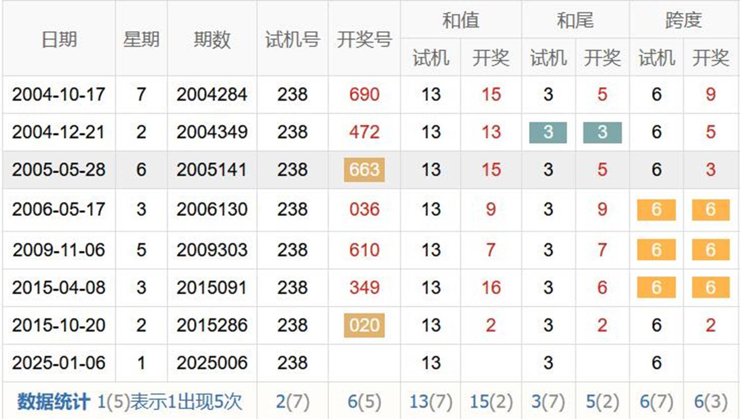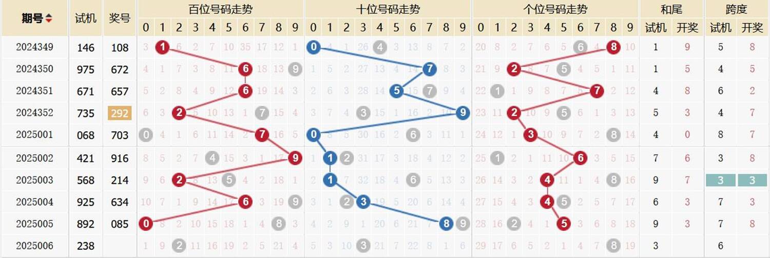 期数 | 试机号 | 关注码 | 金码 | 对应码 | 开奖号 | 出号 |