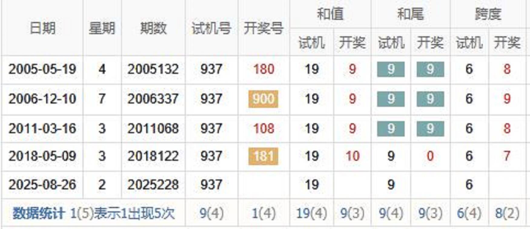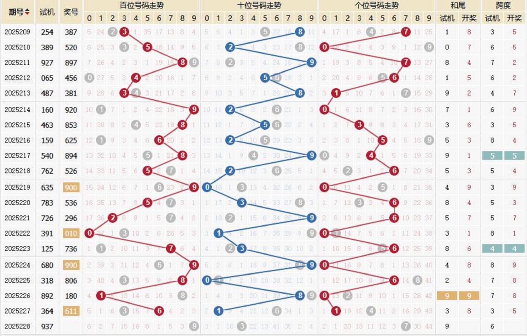 期数 | 试机号 | 关注码 | 金码 | 对应码 | 开奖号 | 出号 |
