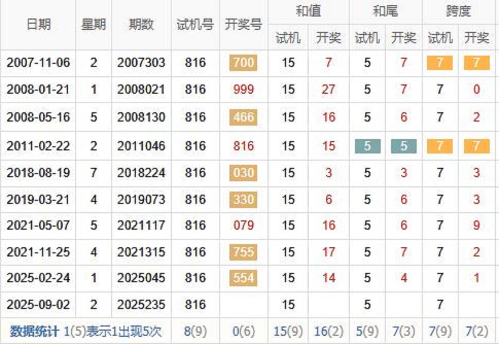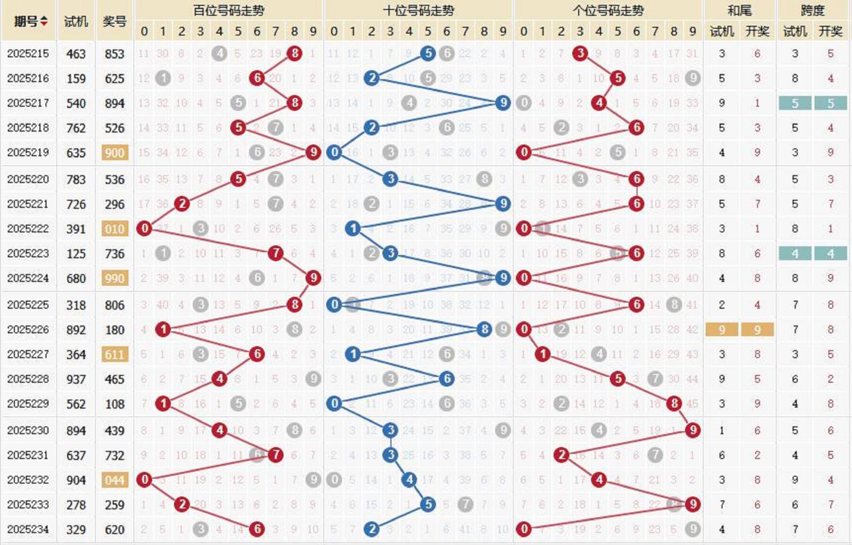 期数 | 试机号 | 关注码 | 金码 | 对应码 | 开奖号 | 出号 |