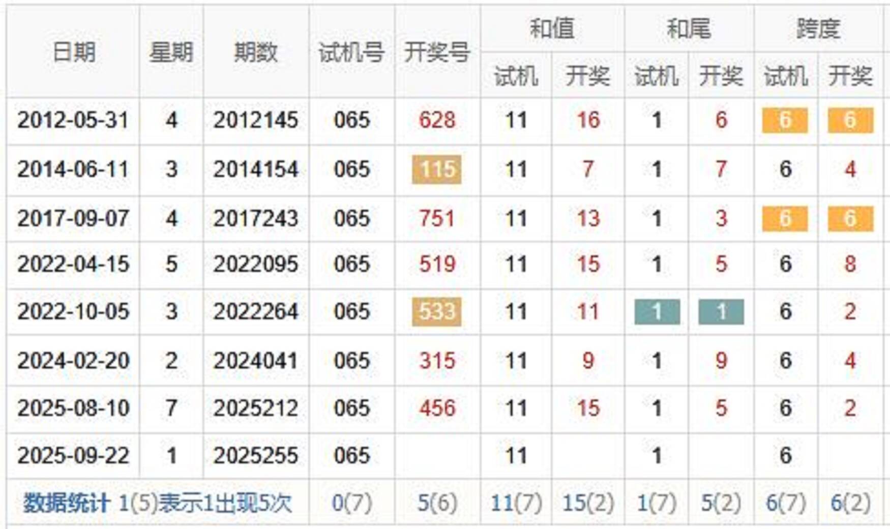 期数 | 试机号 | 关注码 | 金码 | 对应码 | 开奖号 | 出号 |