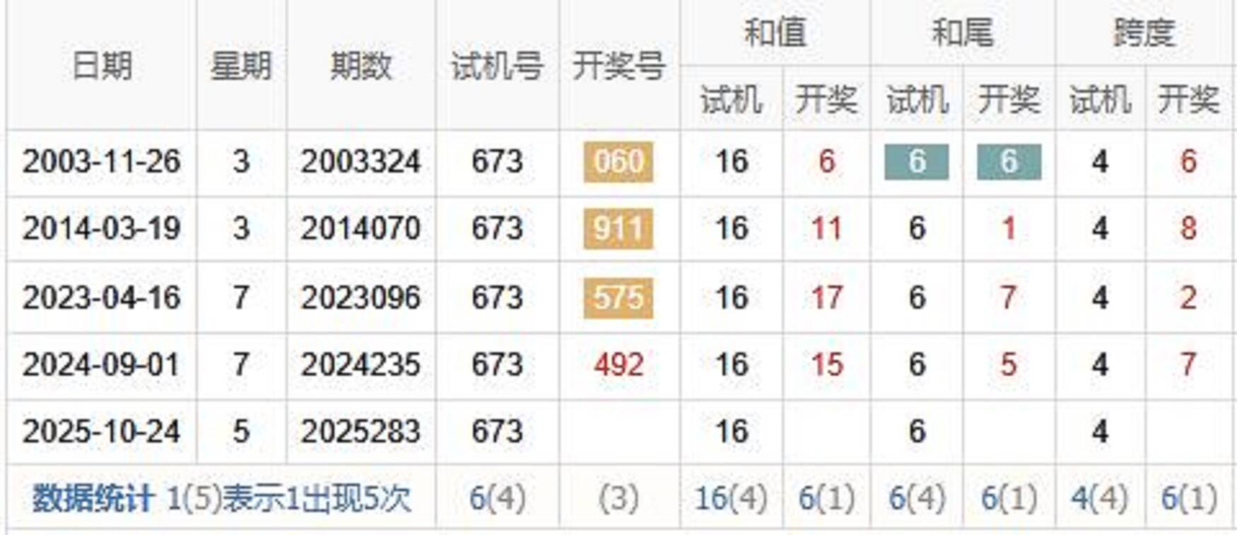 期数 | 试机号 | 关注码 | 金码 | 对应码 | 开奖号 | 出号 |