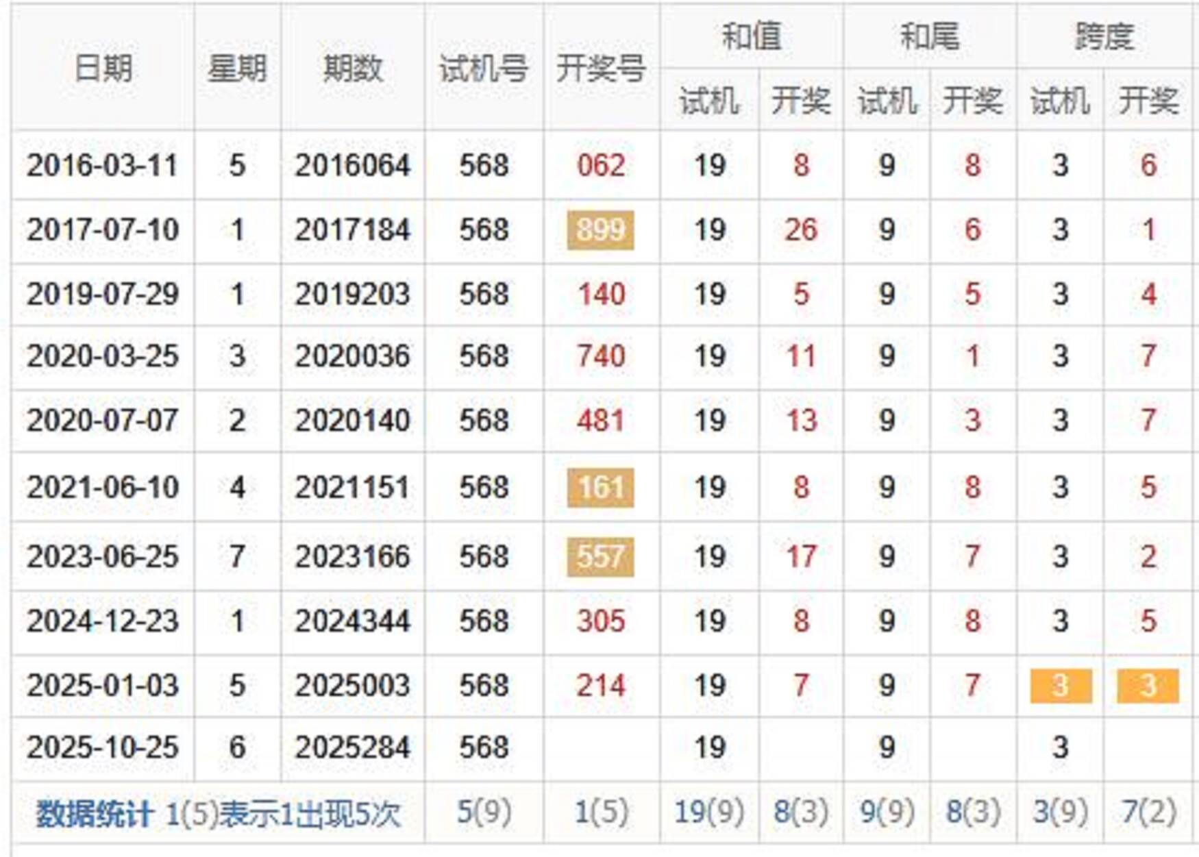 期数 | 试机号 | 关注码 | 金码 | 对应码 | 开奖号 | 出号 |