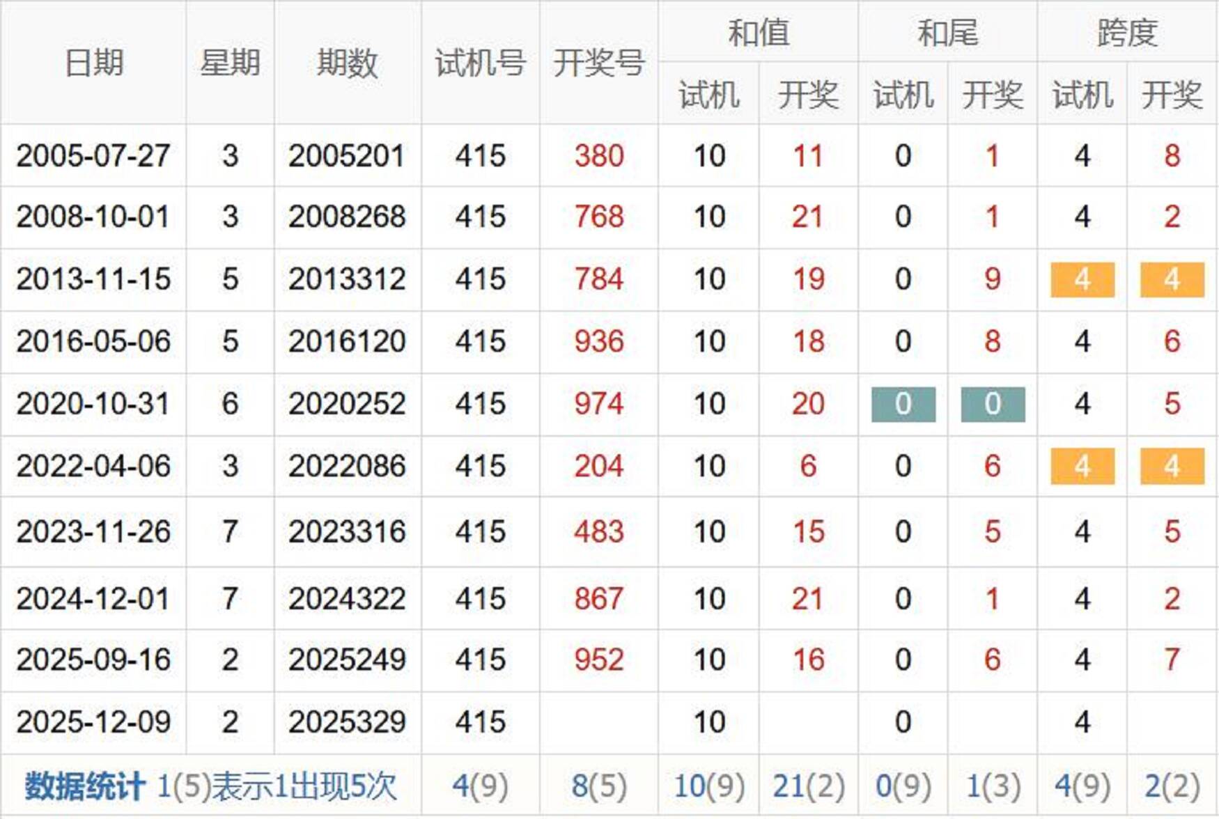 历史出现情况统计