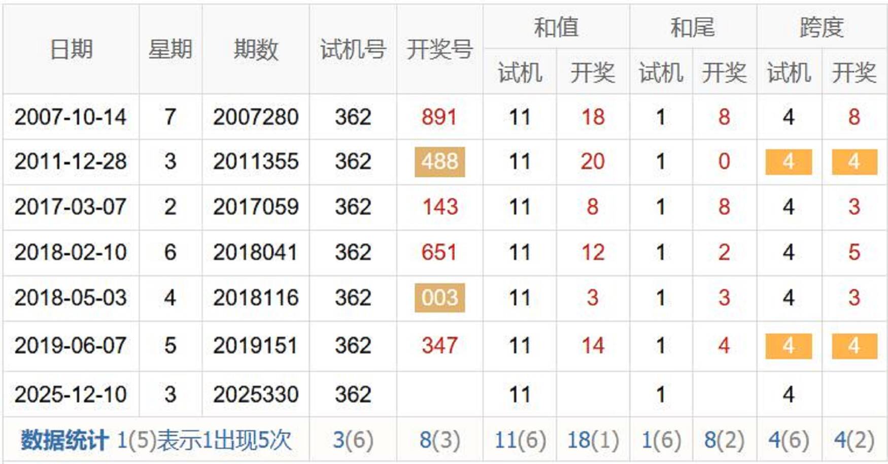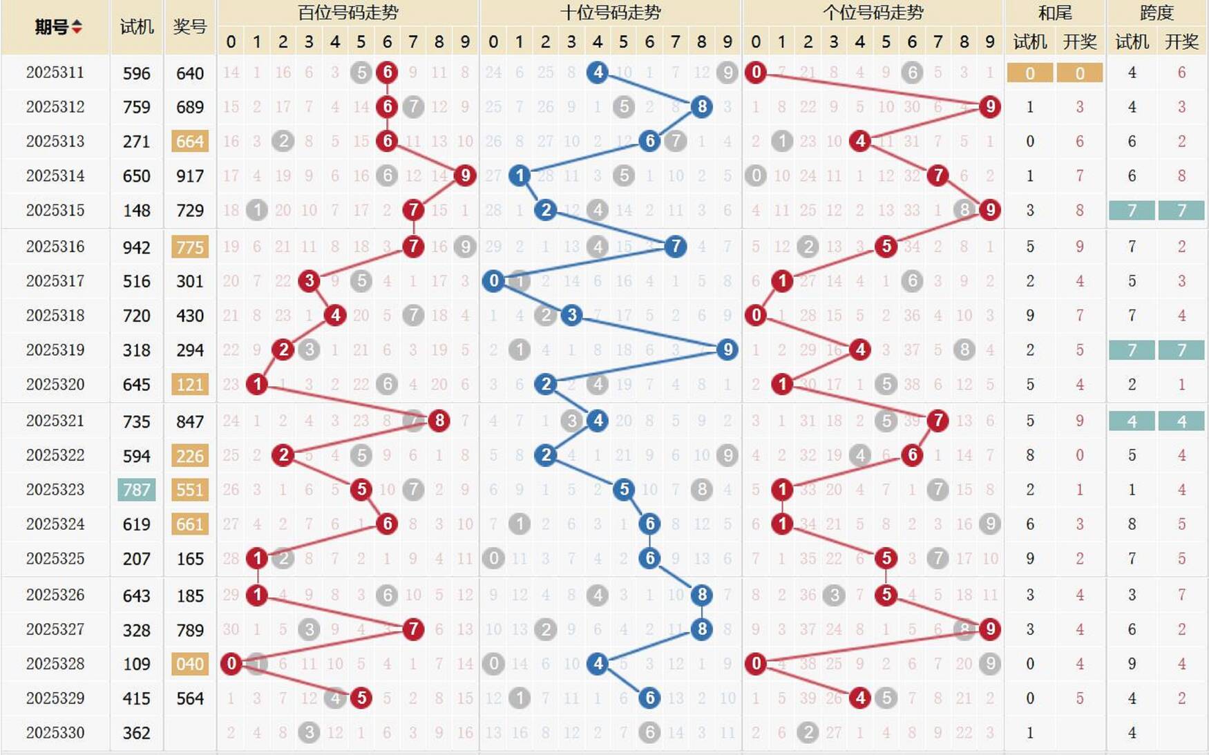 期数 | 试机号 | 关注码 | 金码 | 对应码 | 开奖号 | 出号 |