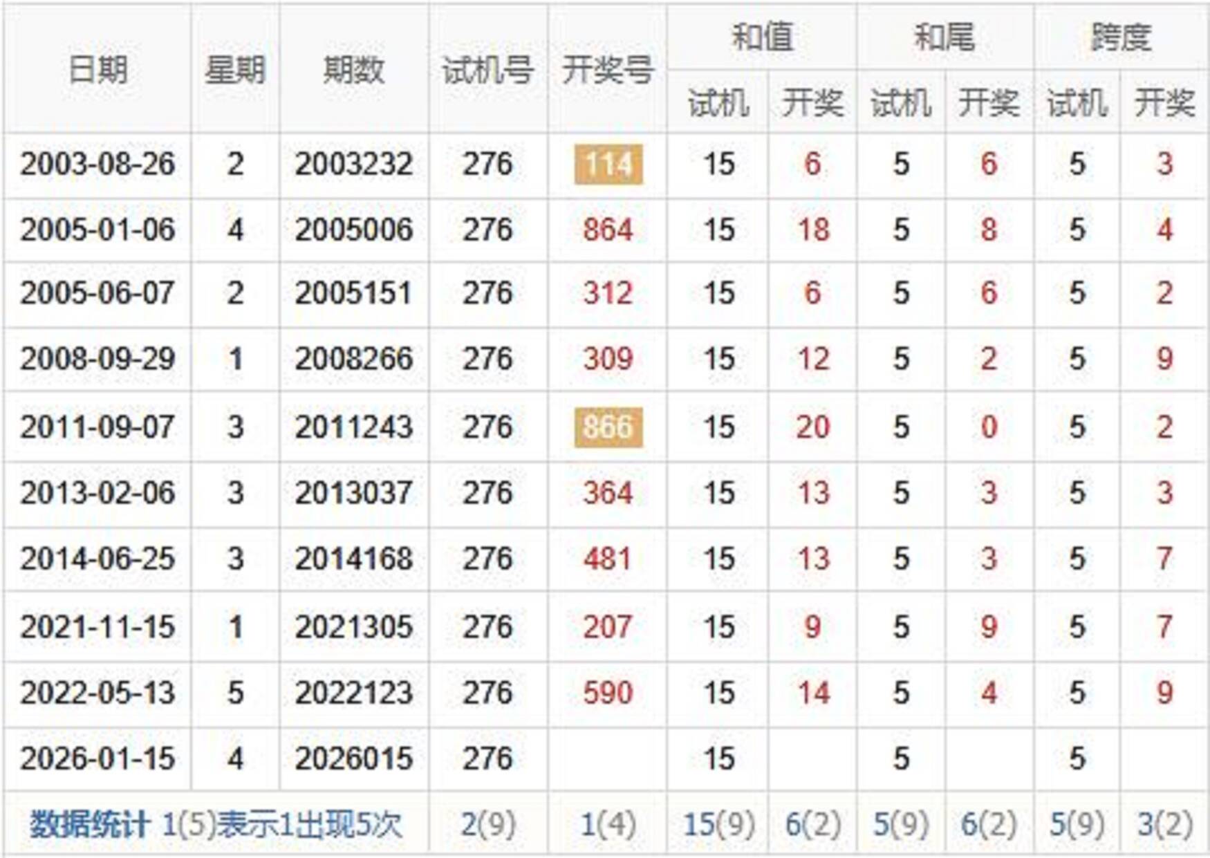 2004015期 试机号 593 开奖号 135 和 9